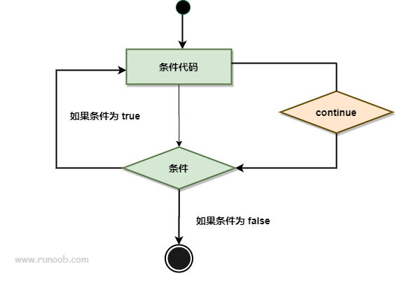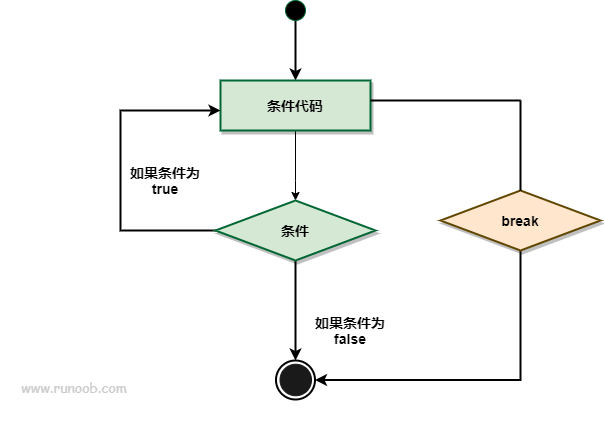 ## Go 语言循环语句 在不少实际问题中有许多具有规律性的重复操作,因此在程序中就需要重复执行某些语句。 以下为大多编程语言循环程序的流程图:  Go 语言提供了以下几种类型循环处理语句: |循环类型 |描述| |-|-| |for 循环 |重复执行语句块| |循环嵌套 |在 for 循环中嵌套一个或多个 for 循环| ## 循环控制语句 循环控制语句可以控制循环体内语句的执行过程。 GO 语言支持以下几种循环控制语句: |控制语句 |描述| |-|-| |break 语句 |经常用于中断当前 for 循环或跳出 switch 语句| |continue 语句 |跳过当前循环的剩余语句,然后继续进行下一轮循环。| |goto 语句 |将控制转移到被标记的语句。| ## 无限循环 如果循环中条件语句永远不为 false 则会进行无限循环,我们可以通过 for 循环语句中只设置一个条件表达式来执行无限循环: 实例 ```go package main import "fmt" func main() { for true { fmt.Printf("这是无限循环。\n"); } } ``` ## for 循环 for 循环是一个循环控制结构,可以执行指定次数的循环。 语法 Go 语言的 For 循环有 3 种形式,只有其中的一种使用分号。 和 C 语言的 for 一样: `for init; condition; post { }` 和 C 的 while 一样: `for condition { }` 和 C 的 `for(;;)` 一样: `for { }` init: 一般为赋值表达式,给控制变量赋初值; condition: 关系表达式或逻辑表达式,循环控制条件; post: 一般为赋值表达式,给控制变量增量或减量。 for语句执行过程如下: 1、先对表达式 1 赋初值; 2、判别赋值表达式 init 是否满足给定条件,若其值为真,满足循环条件,则执行循环体内语句,然后执行 post,进入第二次循环,再判别 condition;否则判断 condition 的值为假,不满足条件,就终止for循环,执行循环体外语句。 for 循环的 range 格式可以对 slice、map、数组、字符串等进行迭代循环。格式如下: ```go for key, value := range oldMap { newMap[key] = value } ``` 以上代码中的 key 和 value 是可以省略。 如果只想读取 key,格式如下: `for key := range oldMap` 或者这样: `for key, _ := range oldMap` 如果只想读取 value,格式如下: `for _, value := range oldMap` for 语句语法流程如下图所示: 实例 计算 1 到 10 的数字之和: 实例 ```go package main import "fmt" func main() { sum := 0 for i := 0; i <= 10; i++ { sum += i } fmt.Println(sum) } ``` 输出结果为: 55 init 和 post 参数是可选的,我们可以直接省略它,类似 While 语句。 以下实例在 sum 小于 10 的时候计算 sum 自相加后的值: 实例 ```go package main import "fmt" func main() { sum := 1 for ; sum <= 10; { sum += sum } fmt.Println(sum) // 这样写也可以,更像 While 语句形式 for sum <= 10{ sum += sum } fmt.Println(sum) } ``` 输出结果为: 16 16 无限循环: 实例 ```go package main import "fmt" func main() { sum := 0 for { sum++ // 无限循环下去 } fmt.Println(sum) // 无法输出 } ``` 要停止无限循环,可以在命令窗口按下ctrl-c 。 ### For-each range 循环 这种格式的循环可以对字符串、数组、切片等进行迭代输出元素。 实例 ```go package main import "fmt" func main() { strings := []string{"google", "runoob"} for i, s := range strings { fmt.Println(i, s) } numbers := [6]int{1, 2, 3, 5} for i,x:= range numbers { fmt.Printf("第 %d 位 x 的值 = %d\n", i,x) } } ``` 以上实例运行输出结果为: 0 google 1 runoob 第 0 位 x 的值 = 1 第 1 位 x 的值 = 2 第 2 位 x 的值 = 3 第 3 位 x 的值 = 5 第 4 位 x 的值 = 0 第 5 位 x 的值 = 0 for 循环的 range 格式可以省略 key 和 value,如下实例: 实例 ```go package main import "fmt" func main() { map1 := make(map[int]float32) map1[1] = 1.0 map1[2] = 2.0 map1[3] = 3.0 map1[4] = 4.0 // 读取 key 和 value for key, value := range map1 { fmt.Printf("key is: %d - value is: %f\n", key, value) } // 读取 key for key := range map1 { fmt.Printf("key is: %d\n", key) } // 读取 value for _, value := range map1 { fmt.Printf("value is: %f\n", value) } } ``` 以上实例运行输出结果为: key is: 4 - value is: 4.000000 key is: 1 - value is: 1.000000 key is: 2 - value is: 2.000000 key is: 3 - value is: 3.000000 key is: 1 key is: 2 key is: 3 key is: 4 value is: 1.000000 value is: 2.000000 value is: 3.000000 value is: 4.000000 Go 语言循环语句Go 语言循环语句 ## 循环嵌套 Go 语言允许用户在循环内使用循环。接下来我们将为大家介绍嵌套循环的使用。 语法 以下为 Go 语言嵌套循环的格式: ```go for [condition | ( init; condition; increment ) | Range] { for [condition | ( init; condition; increment ) | Range] { statement(s); } statement(s); } ``` 实例 以下实例使用循环嵌套来输出 2 到 100 间的素数: ```go package main import "fmt" func main() { /* 定义局部变量 */ var i, j int for i=2; i < 100; i++ { for j=2; j <= (i/j); j++ { if(i%j==0) { break; // 如果发现因子,则不是素数 } } if(j > (i/j)) { fmt.Printf("%d 是素数\n", i); } } } ``` 以上实例运行输出结果为: 2 是素数 3 是素数 5 是素数 7 是素数 11 是素数 13 是素数 17 是素数 19 是素数 23 是素数 29 是素数 31 是素数 37 是素数 41 是素数 43 是素数 47 是素数 53 是素数 59 是素数 61 是素数 67 是素数 71 是素数 73 是素数 79 是素数 83 是素数 89 是素数 97 是素数 ## break语句 在 Go 语言中,break 语句用于终止当前循环或者 switch 语句的执行,并跳出该循环或者 switch 语句的代码块。 break 语句可以用于以下几个方面:。 用于循环语句中跳出循环,并开始执行循环之后的语句。 break 在 switch 语句中在执行一条 case 后跳出语句的作用。 break 可应用在 select 语句中。 在多重循环中,可以用标号 label 标出想 break 的循环。 语法 break 语法格式如下: `break` break 语句流