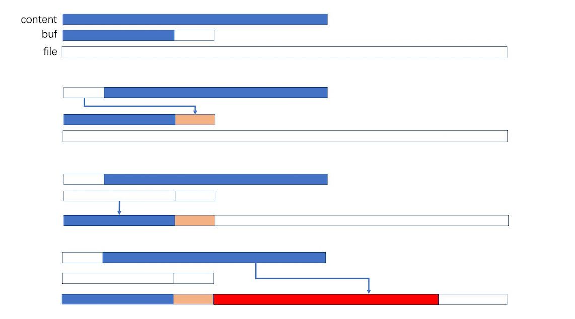 ## 一、bufio包原理 bufio 是通过缓冲来提高效率。 io操作本身的效率并不低,低的是频繁的访问本地磁盘的文件。所以bufio就提供了缓冲区(分配一块内存),读和写都先在缓冲区中,最后再读写文件,来降低访问本地磁盘的次数,从而提高效率。 简单的说就是,把文件读取进缓冲(内存)之后再读取的时候就可以避免文件系统的io 从而提高速度。同理,在进行写操作时,先把文件写入缓冲(内存),然后由缓冲写入文件系统。看完以上解释有人可能会表示困惑了,直接把 内容->文件 和 内容->缓冲->文件相比, 缓冲区好像没有起到作用嘛。其实缓冲区的设计是为了存储多次的写入,最后一口气把缓冲区内容写入文件。  bufio 封装了io.Reader或io.Writer接口对象,并创建另一个也实现了该接口的对象。 io.Reader或io.Writer 接口实现read() 和 write() 方法,对于实现这个接口的对象都是可以使用这两个方法的。 Reader对象 bufio.Reader 是bufio中对io.Reader 的封装 ```go // Reader implements buffering for an io.Reader object. type Reader struct { buf []byte rd io.Reader // reader provided by the client r, w int // buf read and write positions err error lastByte int // last byte read for UnreadByte; -1 means invalid lastRuneSize int // size of last rune read for UnreadRune; -1 means invalid } ``` bufio.Read(p []byte) 相当于读取大小len(p)的内容,思路如下: 1. 当缓存区有内容的时,将缓存区内容全部填入p并清空缓存区 2. 当缓存区没有内容的时候且len(p)>len(buf),即要读取的内容比缓存区还要大,直接去文件读取即可 3. 当缓存区没有内容的时候且len(p)<len(buf),即要读取的内容比缓存区小,缓存区从文件读取内容充满缓存区,并将p填满(此时缓存区有剩余内容) 4. 以后再次读取时缓存区有内容,将缓存区内容全部填入p并清空缓存区(此时和情况1一样) 源码: ```go // Read reads data into p. // It returns the number of bytes read into p. // The bytes are taken from at most one Read on the underlying Reader, // hence n may be less than len(p). // To read exactly len(p) bytes, use io.ReadFull(b, p). // At EOF, the count will be zero and err will be io.EOF. func (b *Reader) Read(p []byte) (n int, err error) { n = len(p) if n == 0 { return 0, b.readErr() } if b.r == b.w { if b.err != nil { return 0, b.readErr() } if len(p) >= len(b.buf) { // Large read, empty buffer. // Read directly into p to avoid copy. n, b.err = b.rd.Read(p) if n < 0 { panic(errNegativeRead) } if n > 0 { b.lastByte = int(p[n-1]) b.lastRuneSize = -1 } return n, b.readErr() } // One read. // Do not use b.fill, which will loop. b.r = 0 b.w = 0 n, b.err = b.rd.Read(b.buf) if n < 0 { panic(errNegativeRead) } if n == 0 { return 0, b.readErr() } b.w += n } // copy as much as we can n = copy(p, b.buf[b.r:b.w]) b.r += n b.lastByte = int(b.buf[b.r-1]) b.lastRuneSize = -1 return n, nil } ``` 说明: reader内部通过维护一个r, w 即读入和写入的位置索引来判断是否缓存区内容被全部读出。 Writer对象 bufio.Writer 是bufio中对io.Writer 的封装 ```go // Writer implements buffering for an io.Writer object. // If an error occurs writing to a Writer, no more data will be // accepted and all subsequent writes, and Flush, will return the error. // After all data has been written, the client should call the // Flush method to guarantee all data has been forwarded to // the underlying io.Writer. type Writer struct { err error buf []byte n int wr io.Writer } ``` bufio.Write(p []byte) 的思路如下 1. 判断buf中可用容量是否可以放下 p 2. 如果能放下,直接把p拼接到buf后面,即把内容放到缓冲区 3. 如果缓冲区的可用容量不足以放下,且此时缓冲区是空的,直接把p写入文件即可 4. 如果缓冲区的可用容量不足以放下,且此时缓冲区有内容,则用p把缓冲区填满,把缓冲区所有内容写入文件,并清空缓冲区 5. 判断p的剩余内容大小能否放到缓冲区,如果能放下(此时和步骤1情况一样)则把内容放到缓冲区 6. 如果p的剩余内容依旧大于缓冲区,(注意此时缓冲区是空的,情况和步骤3一样)则把p的剩余内容直接写入文件 以下是源码 ```go // Write writes the contents of p into the buffer. // It returns the number of bytes written. // If nn < len(p), it also returns an error explaining // why the write is short. func (b *Writer) Write(p []byte) (nn int, err error) { for len(p) > b.Available() && b.err == nil { var n int if b.Buffered() == 0 { // Large write, empty buffer. // Write directly from p to avoid copy. n, b.err = b.wr.Write(p) } else { n = copy(b.buf[b.n:], p) b.n += n b.Flush() } nn += n p = p[n:] } if b.err != nil { return nn, b.err } n := copy(b.buf[b.n:], p) b.n += n nn += n return nn, nil } ``` 说明: b.wr 存储的是一个io.writer对象,实现了Write()的接口,所以可以使用b.wr.Write(p) 将p的内容写入文件。 b.flush() 会将缓存区内容写入文件,当所有写入完成后,因为缓存区会存储内容,所以需要手动flush()到文件。 b.Available() 为buf可用容量,等于len(buf) - n。 下图解释的是其中一种情况,即缓存区有内容,剩余p大于缓存区  ## 二、bufio包 bufio包实现了有缓冲的I/O。它包装一个io.Reader或io.Writer接口对象,创建另一个也实现了该接口,且同时还提供了缓冲和一些文本I/O的帮助函数的对象。 bufio.Reader: bufio.Reader 实现了如下接口: io.Reader io.WriterTo io.ByteScanner io.RuneScanner ```go // NewReaderSize 将 rd 封装成一个带缓存的 bufio.Reader 对象, // 缓存大小由 size 指定(如果小于 16 则会被设置为 16)。 // 如果 rd 的基类型就是有足够缓存的 bufio.Reader 类型,则直接将 // rd 转换为基类型返回。 func NewReaderSize(rd io.Reader, size int) *Reader // NewReader 相当于 NewReaderSize(rd