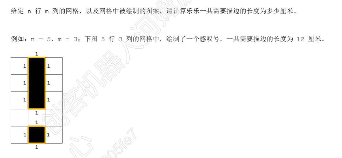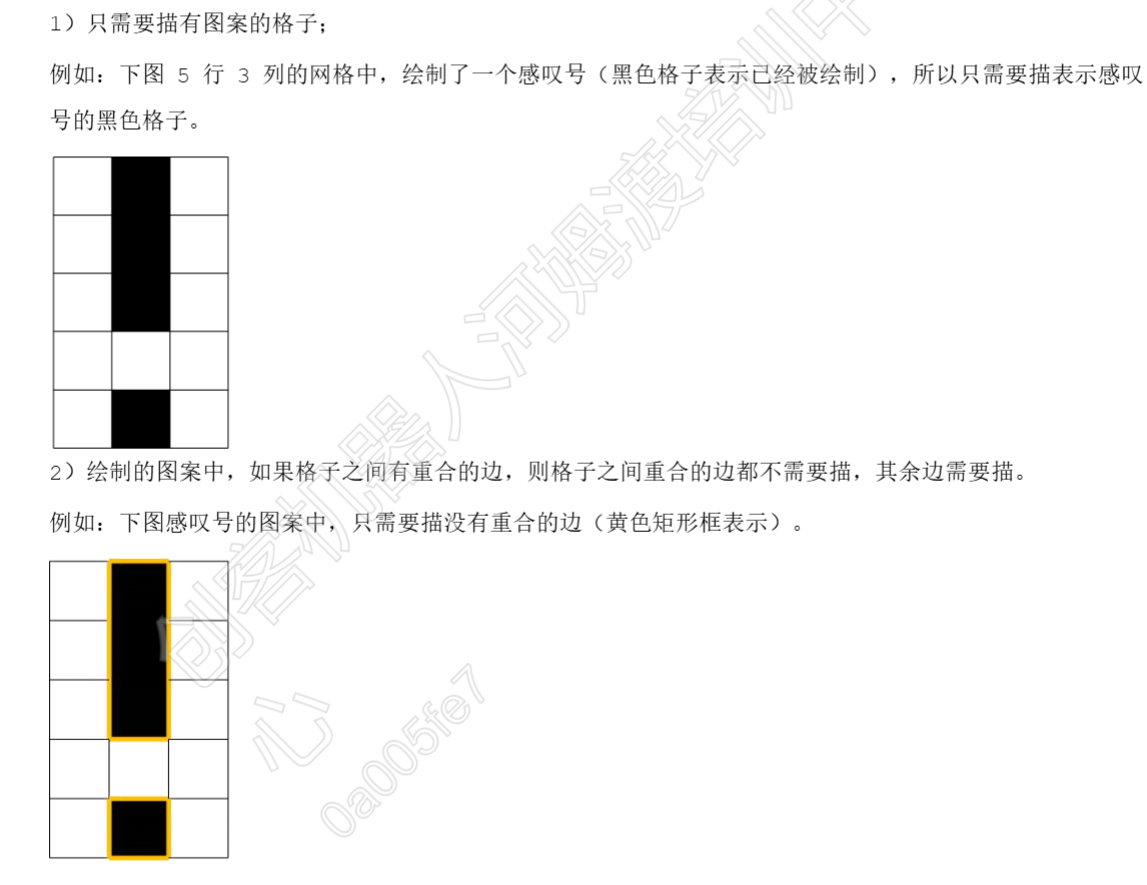 # STEMA考试 C++试卷(6月)- STEMA国考 ## 一、选择题 ### 第一题 下列选项中,关于 C++ 注释语法正确的是( C)。 A、/* this is a comment B、# this is a comment C、// this is a comment D、*/ this is a comment /* ### 第二题 表达式 (16<sub>8</sub> - 1011<sub>2</sub>) * E<sub>16 </sub>的结果的十进制形式是(D )。 A、42 B、43 C、44 D、45 ### 第三题 假设 int 类型存储的数值范围是 -32768 到 32767,则其占用的内存大小为( B )。 A、1 字节 B、2 字节 C、4 字节 D、8 字节 ### 第四题 一棵包含 2025 个节点的二叉树,根节点高度为 1,该二叉树高度最小为(c)。 A、9 B、10 C、11 D、12 ### 第五题 运行以下程序,输出的结果是( )。 ```cpp int func(int x, int y) { int result = (x & y) | (x >> 2); return result; } int main(){ int a = 0xAF, b = 0xB56; int c = func(a, b); int d = func(b, a); int finalResult = (c ^ d) & (a | (b << 1)); cout << finalResult; return 0; } ``` A、678 B、680 C、682 D、684 要解决这个问题,核心是**逐行拆解位运算**,先明确十六进制与二进制/十进制的转换,再按位运算规则(与&、或|、异或^、移位>>/<<)逐步计算。 #### 步骤1:明确初始值(十六进制转十进制/二进制) - `a = 0xAF`:十六进制转十进制为 \(10×16 + 15 = 175\),二进制为 `1010 1111`。 - `b = 0xB56`:十六进制转十进制为 \(11×16² + 5×16 + 6 = 2902\),二进制为 `1011 0101 0110`。 #### 步骤2:计算 `func(a, b)`(即 `c`) `func(x,y) = (x&y) | (x>>2)`,代入 `x=a=0xAF`,`y=b=0xB56`: 1. **计算 `x&y`(按位与)**: 对齐二进制后逐位与(仅对应位都为1时结果为1): ``` 0xAF: 0000 0000 1010 1111 0xB56: 0000 1011 0101 0110 &结果: 0000 0000 0000 0110 → 十进制6(0x6) ``` 2. **计算 x>>2(右移2位)**: `0xAF >> 2` 即 `1010 1111 >> 2 = 101011`,十进制为43(0x2B)。 3. **计算 `(x&y)|(x>>2)`(按位或)**: `6 | 43 = 0x6 | 0x2B = 0x2F`,十进制为47。 因此 `c = 47`。 #### 步骤3:计算 `func(b, a)`(即 `d`) 代入 `x=b=0xB56`,`y=a=0xAF`: 1. **计算 `x&y`**:按位与满足交换律,结果仍为6(0x6)。 2. **计算 `x>>2`(右移2位)**: `0xB56 >> 2 = 1011 0101 0110 >> 2 = 1011 0101 01`,十进制为725(0x2D5)。 3. **计算 `(x&y)|(x>>2)`**: `6 | 725 = 0x6 | 0x2D5 = 0x2D7`,十进制为727。 因此 `d = 727`。 #### 步骤4:计算 `c^d`(异或) 异或规则:对应位不同为1,相同为0。 - `c=47`(二进制:`0000 0000 0010 1111`) - `d=727`(二进制:`0000 0010 1101 0111`) - 异或结果:`0000 0010 1111 1000` → 十进制760(0x2F8)。 #### 步骤5:计算 `a | (b<<1)`(按位或) 1. **计算 `b<<1`(左移1位)**:`0xB56 << 1 = 0x16AC`,十进制5804。 2. **计算 `a | (b<<1)`**: `0xAF | 0x16AC = 0x16AF`,十进制5807(二进制:`0001 0110 1010 1111`)。 #### 步骤6:计算最终结果 `(c^d) & (a | (b<<1))` 按位与规则:对应位都为1时结果为1。 - `c^d=760`(0x2F8,二进制:`0000 0010 1111 1000`) - `a|(b<<1)=5807`(0x16AF,二进制:`0001 0110 1010 1111`) - 按位与结果:`0000 0010 1010 1000` → 十进制680(0x2A8)。 #### 最终结论 输出结果为 680,对应选项 B。 ## 二、编程题 ### 第一题 **编程实现:**水箱加水 **题目描述:**有一个空水箱,李莉在 T1 时刻向水箱中加入 V1 升水,然后在同一天的 T2 时刻又向水箱中加入 V2 升水(加水消耗的时间忽略不计,水箱的容积足够大)。水箱有一个排水孔,每个小时会排出 1 升水,请问在 T2 时刻加完水后,水箱中一共有多少升水? **输入描述:**一行输入四个整数 T1、V1、T2、V2(0≤T1<T2≤23,1≤V1,V2≤100),分别表示第一次加水的时刻, 第一次加水的体积,第二次加水的时刻,第二次加水的体积,整数之间以一个空格隔开。 **输出描述:**输出一个整数,表示李莉在 T2 时刻加完水后,水箱中水的总体积。 **样例输入:**3 10 10 20 **样例输出:**23 ```cpp #include <iostream> using namespace std; const int N = 100; int a[N][N]; int main() { int t1,v1,t2,v2; cin>>t1>>v1>>t2>>v2; int v = v1-(t2-t1); if(v<0) { v=+v2; } else{ v += +v2; } cout<<v<<endl; return 0; } ``` ### 第二题 **编程实现:**图案描边 **题目描述:**乐乐有一张 n 行 m 列的网格纸,每个格子都是边长为 1 厘米的正方形,网格被绘制了一些图案。乐乐准备沿着图案的边缘进行描边,描边的规则如下:   **输入描述:**第一行输入两个整数 n 和 m(1≤n,m≤100),分别表示网格的行数和列数,整数之间以一个空格隔开;接下来输入 n 行,每行 m 个整数,整数为 1 或 0,1 表示该格子被绘制,0 表示该格子没有被绘制,整数之间以一个空格隔开。 **输出描述**:输出一个整数,表示乐乐一共需要描边的长度。 **样例输入:** 5 3 0 1 0 0 1 0 0 1 0 0 0 0 0 1 0 **样例输出:** 12 ```cpp #include <iostream> using namespace std; const int N = 100; int a[N][N]; int main() { int n,m,cnt=0; cin>>n>>m; for(int i = 0;i < n;i ++) { for(int j = 0;j < m;j ++) { cin>>a[i][j]; } } for(int i = 0;i < n;i ++) { for(int j = 0;j < m;j ++) { if(a[i][j]==1) { // 上边 if(i == 0){ cnt++; } else { if(a[i-1][j] == 0) cnt++; } // 下边 if(i == n-1) { cnt ++; } else { if(a[i+1][j] == 0) cnt++; } // 左边 if(j == 0) { cnt++; } else { if(a[i][j-1] == 0) cnt++; } // 右边 if(j == n-1) { cnt ++; } else { if(a[i][j+1] == 0) cnt++; } } } } cout<< cnt <<endl; return 0; } ``` ### 第三题 **编程实现:**美食节 **题目描述:** 在一次美食节上,组委会为市民们准备了 n 种小吃,其中第 i 种小吃有 ai 份。组委会规定: 1)每位市民最多可以领取 x 份小吃; 2)对于同一种小吃,每位市民最多领取 2 份。 请计算最少需要多少位市民,才能把所有的小吃领取完。 **输入描述:** 第一行输入两个整数 n 和 x(1≤n≤105,2≤x≤100),分别表示小吃的种类数以及每位市民最多能领取的小吃份数,整数之间以一个空格隔开; 第二行输入 n 个整数 ai(1≤ai≤109),分别表示每种